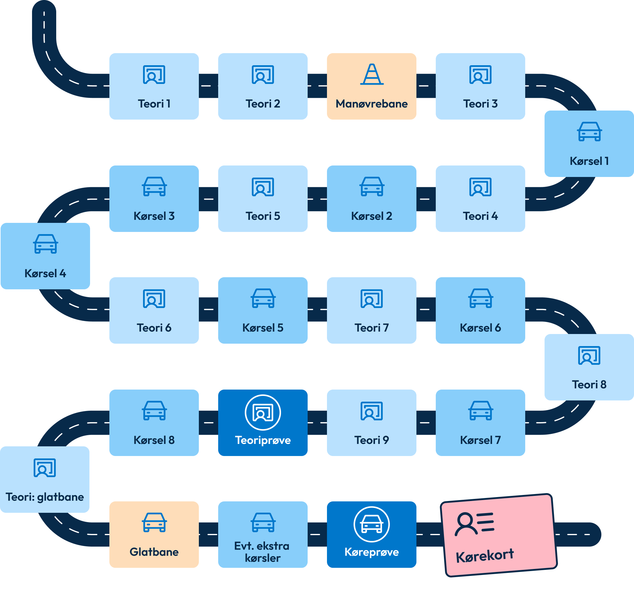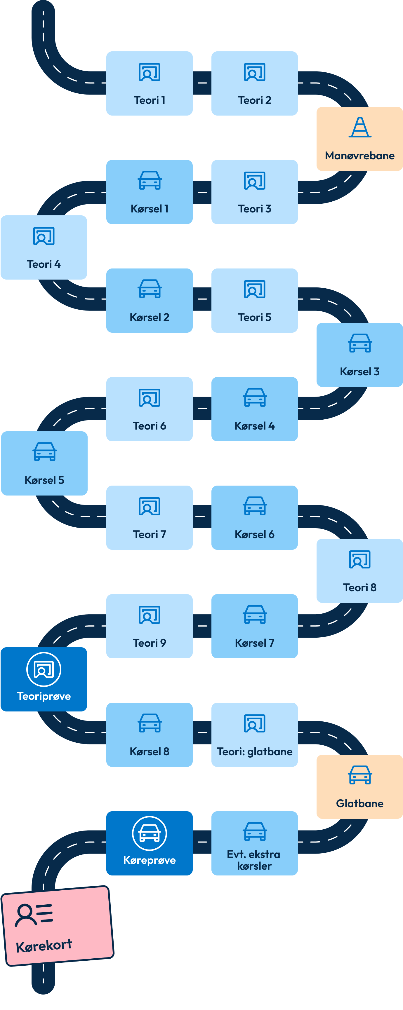 På tegningen herover kan du se hele dit kørekortforløb.